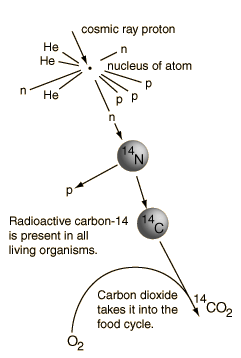 Los protones de los rayos cósmicos, explosionan los núcleos de la atmósfera superior, produciendo a su vez, neutrones que bombardean el nitrógeno, principal constituyente de la atmósfera. Este bombardeo de neutrones produce el isótopo radioactivo carbono-14. El carbono-14 radiactivo se combina con el oxígeno para formar dióxido de carbono, y se incorpora en el ciclo de los seres vivos.